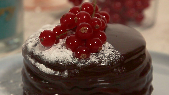 Préparez votre glaçage au chocolat.Hachez 300 g de chocolat noir et mettez le dans un saladier. Faites bouillir 300g de crème liquide dans une casserole puis versez 1/3 de la crème sur le chocolat. Mélangez avec une maryse et émulsionnez sans incorporer de l'air. Versez la crème restante et mélangez. Ajoutez un peu de beurre. Quand votre glaçage est bien lisse et bien brillant, versez le sur votre gâteau de crêpes.