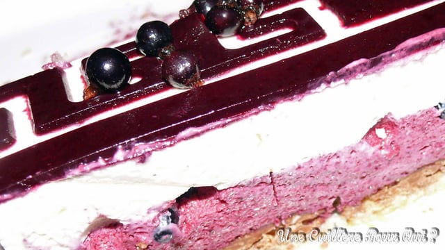 Mettre quelques grains de cassis (facultatif) sur la mousse au chocolat blanc et verser la mousse au cassis par dessus.Poser le biscuit croustillant praliné sur la mousse au cassis.Placer au congélateur pendant 3 heures minimum.