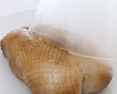 Lever les filets du coffre une fois cuits. Mettre le magret dans une assiette, le positionner sous une cloche et le fumer avec une pipe à fumer aromatisée à la sciure de bois.