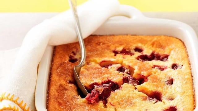 Mélanger à l'aide d'un fouet. Répartir les griottes dans un moule à manqué, les recouvrir de la pâte obtenue et enfourner pendant 45 min.