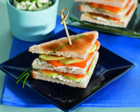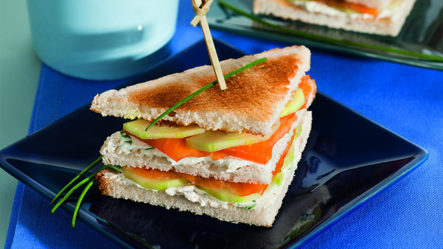 Coupez le concombre en fines tranches et les déposer sur le fromage. Ajoutez le saumon.