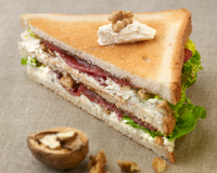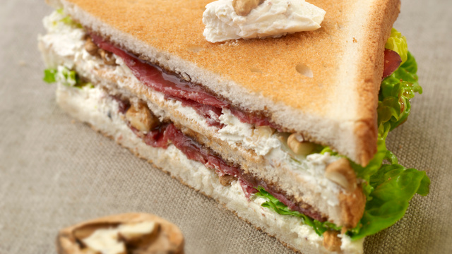 Tartinez l'autre face de fromage et y déposer le reste des ingrédients. Terminez par une tartine à la crème de pruneaux, face tartinée vers le bas. Coupez en triangles.