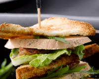 Pour monter le club-sandwich, déposer sur une belle assiette un premier triangle de pain de mie, puis ajouter sur le dessus quelques feuilles de mesclun, ensuite une fine tranche de magret et enfin une tranche de foie gras.