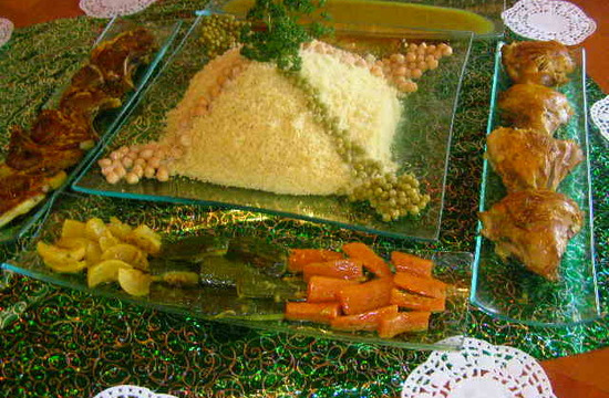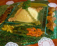 Présenter, le couscous dans un plat de service, les légumes dans un 2eme plat et les viandes dans un 3eme plat. Le bouillon sera présenté dans un petit saladier et dans la saucière, la sauce piquante.