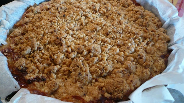 Ajouter la pâte à crumble sur le dessus en répartissant bien mais sans tasser.