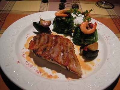 - Monter les chartreuses de choux vert en incorporant la purée de topinambour à l'aide de petits cylindres, finir le jus de coquillages en ajoutant les tomates séchées, le jus de citron et le piment d'espelette, faire revenir les filets de maigre de façon à obtenir une coloration régulière du xingar puis finir à four chaud.