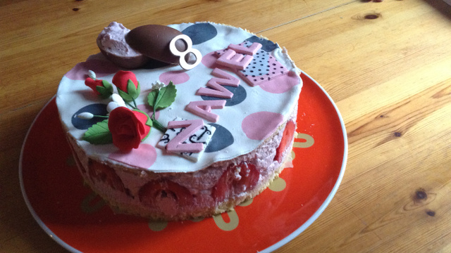 Réduire la moitié des fraises à la casserole, puis mixer, ajouter le mélange au mascarpone + faux sucre ( selon votre gout ). Faire une chantilly et incorporer doucement le mélange fraise/marcarpone. Monter le gâteau en fraisier.