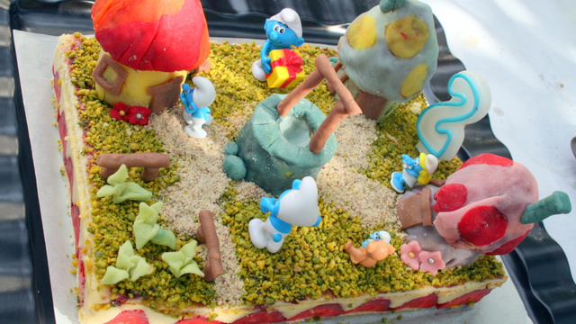 Pour le décor, réaliser les maisons des schtroumpfs avec les chutes de génoise collées avec du nutella et recouvertes de pâte d'amande colorée.