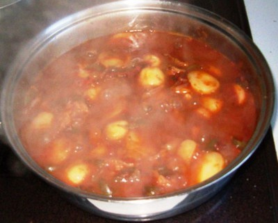 Puis on y ajoute des pommes de terre coupés, on ajoute encore un peu de l'eau et on laisse encore cuire