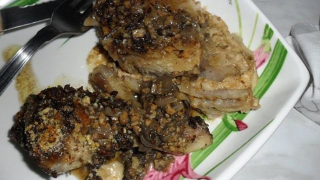Dans une poêle mettre un peu d'huile d'olive et les oignons, faites revenir 5 minutes, ajouter un peu d'eau réduire la puissance, et ajouter les noix, faites mijoter 20 minutes, en dernier mettre du sel et du poivre, et rajouter de l'eau quand il le faut. - 3