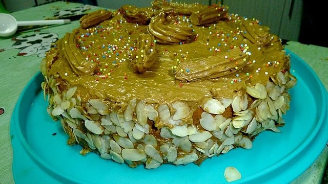 Masquez les étages autour du gâteau avec une fine couche de crème et collez dessus des amandes effilées.