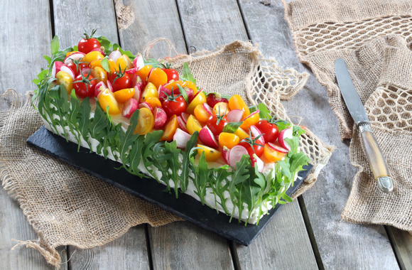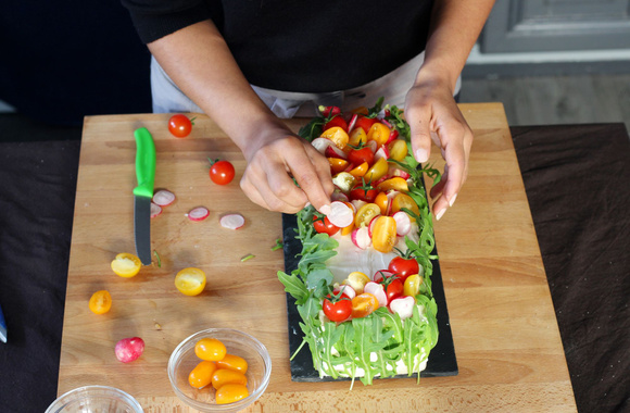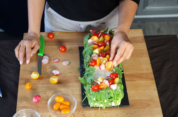 Décorez la surface avec des tomates entières, des tomates coupées en deux, des rondelles de radis, ... de façon harmonieuse.