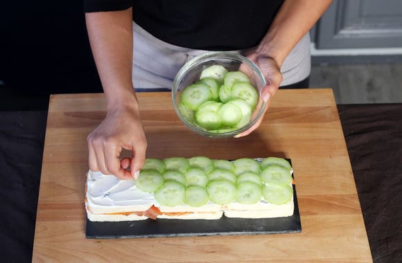 Sur la couche de saumon, déposez de nouveau 3 tranches de pain de mie que vous tartinez de fromage frais. Puis déposez une couche de rondelles de concombre. Le concombre va apporter du croquant.