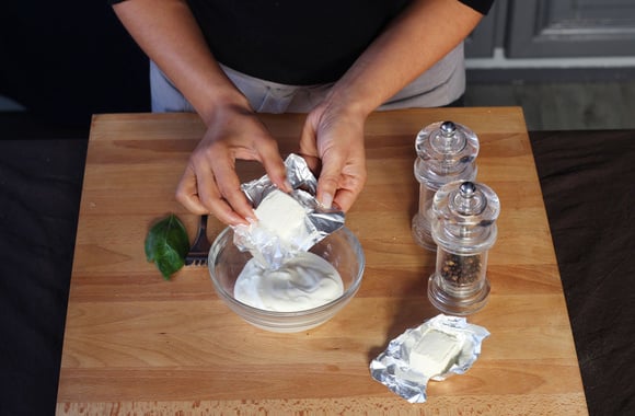 Dans un saladier, mélangez la moitié du Philadelphia avec 3 Carré Frais.