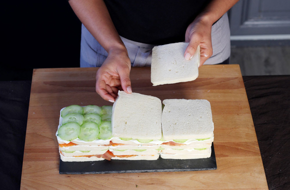 Sur la couche de concombre, déposez de nouveau 3 tranches de pain de mie que vous tartinez de fromage frais. Puis déposez une nouvelle couche de saumon fumé.