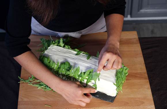 Placez des feuilles de roquettes sur tout le pourtour du Sandwich Cake. Elles vont coller au contact de la préparation au fromage frais.