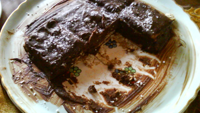 Nappez de chocolat et ainsi de suite sur 4 étages de biscuits (en terminant par une couche de chocolat)Réservez 12 h au réfrigérateur.