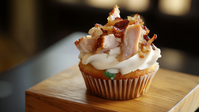 Un cupcake au poulet parfumé au paprika surmonté d'un fromage frais à la ciboulette, d'aiguillettes de poulet et d'un croquant poulet aux noix et au caramel...Un petit cupcake qui sera apprécié par les petits et les grands lors de vos pique-niques !