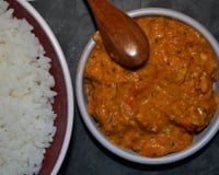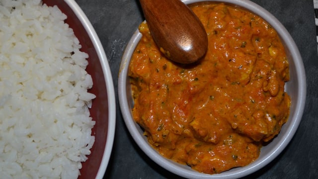 Ajoutez les tomates concassées, la purée de tomate et le sucre. Portez à ébullition puis laissez mijoter pendant 15 minutes à feu doux. Ajoutez la crème, les amandes, le beurre et la coriandre. Salez.