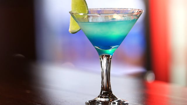 Dans un shaker à ½ rempli de glace je verse mes ingrédients (sauf le curaçao). Je frappe puis je verse dans 2 verres à cocktail sur un lit de glace pilée. Je termine en ajoutant le curaçao.