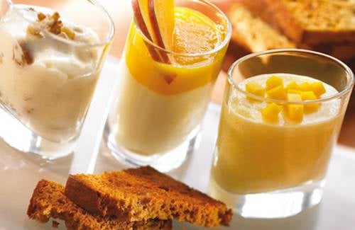 Incorporez la moitié de la purée de mangue à la troisième part, mélangez, distribuez dans 4 petits verres et laissez reposer. - 6Finition :Disposez 3 petits verres (un de chaque goût) sur une assiette à dessert. Remplissez le premier verre avec le reste de la purée de mangue et saupoudrez de quelques noix. Décorez les assiettes avec les fines tranches de pain d'épice croquant.