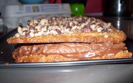 Lorsque le gâteau est froid, coupez le en 2 et recouvrez la partie, sans noisettes concassées de crème ganache. Posez l'autre moitié du gâteau sur la ganache et réservez au frais.