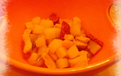 Faites revenir l'oignon et les chorizo 5 min dans l'huile d'olive.