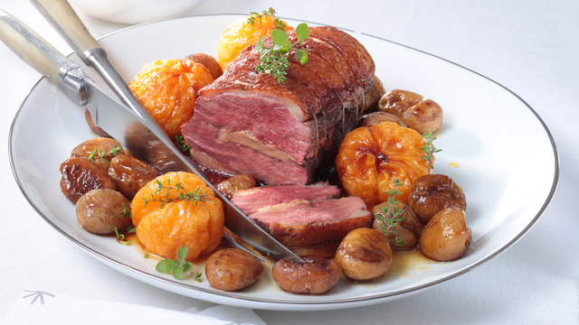 Sortir le rôti de Magret du four, le déposer dans un grand plat avec les clémentines, les marrons et le jus de cuisson. À découper avec les grands couverts de service.
