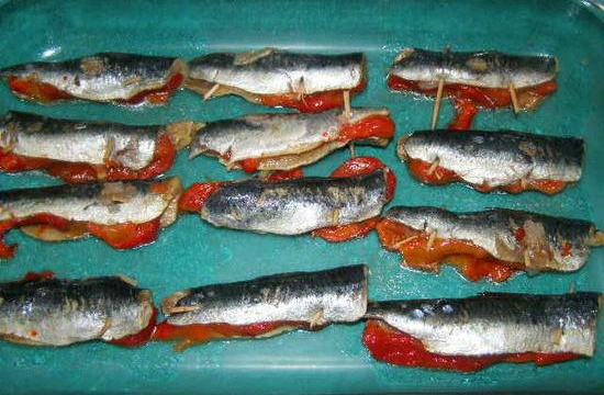 Faire griller les poivrons au four, les éplucher et les découper en lanières. En farcir les sardines en les maintenant bien fermées à l'aide des cure dents. Les disposer sur un plat.
