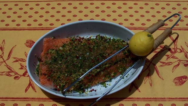 Prélevez les zestes du citron et hachez les avec l'aneth et les baies roses. Faire des entailles sur le filet coté chair et coté peau. Frottez le saumon avec la marinade afin de la faire pénétrer. Laissez reposer 12h minimum afin que les saveurs et les arômes imprègnent le poisson.