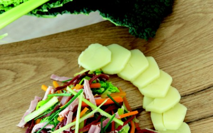 Rajouter le magret de canard fumé et le jambon blanc coupés en julienne. Incorporer à la poêle. Faire sauter. Déguster chaud.