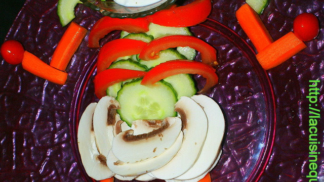 Commencer par les épaule (concombre), les bras (carotte), les mains(tomate cerise), les cotes(tomates et concombre), le bassin (champignon), les jambes (carottes) et les pieds (tomate cerise)