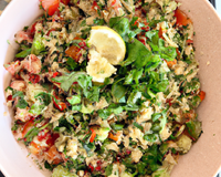 Y ajouter une cuillère à soupe d'huile d'olive, les dés de jambon, 1/2 poivron rouge et vert, les raisins de corinthe, les feuilles de menthe. - 3