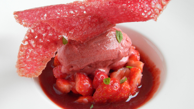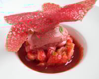 Ce joli dessert, en fait tout simple, se compose d'un sorbet réalisé avec la soupe Andros, de tuiles à la fraise, d'un tartare de fraises au basilic et de soupe de fraises Andros. Très gourmand et très frais, il sera le bienvenu pour terminer un repas en légèreté.