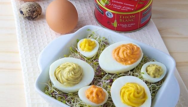 - 4Hachez finement votre thon et répartissez-le équitablement dans les bols de mayonnaise. Mélangez chaque préparation et vérifiez l'assaisonnement avec du sel fin et du poivre du moulin. Coupez vos œufs durs en 2. Retirez délicatement les jaunes. Réservez les blancs d'œuf pour la suite.