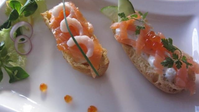 Aclair garnie d'une préparation à base fromage frais et d'herbes garnie de saumon fumé.
