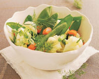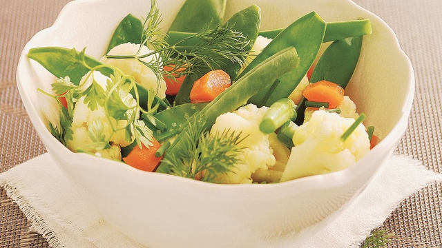Cuisez les légumes à la vapeur, séparément. Assaisonnez les légumes avec de l'huile d'olive vierge extra, de la fleur de sel, du vinaigre de pomme, de la ciboulette ciselée, de l'aneth et du cerfeuil. Les légumes à la vapeur peuvent être consommés chauds ou tièdes.