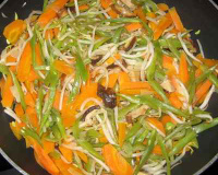 Puis, rincez les champignons et les découpez en fines lamelles que l'on rajoute dans le wok avec 2 cuillères à soupe de sauce soja environ et un peu d'huile de sésame.