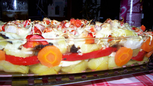 Une fois les légumes cuit disposez des lamelles de pomme de terre au fond d'un plat à gratin et faire des étages avec les carottes, les navet , le céleri et y installer les 6 rondelles de poivron rouge et dedans y mettre des champignon et échalotes et recouvrir encore avec de la pomme de terre et mettez le reste des légumes.