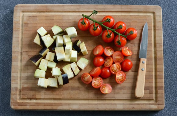 2Coupez l'aubergine en cubes.