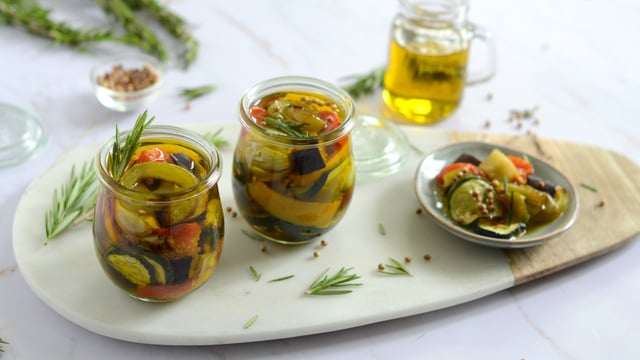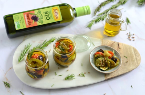 Les légumes marinés à l'huile d'olive Soléou c'est la recette parfaite pour préparer des légumes en grande quantité. Il faut juste les griller ou les rôtir avant puis les stocker dans des bocaux avec de l'huile d'olive Soléou qui va les parfumer à souhait.