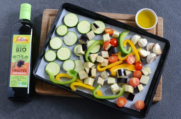 4Arrosez les légumes avec 4 cuillères à soupe d'huile d'olive Soléou. Salez et poivrez.