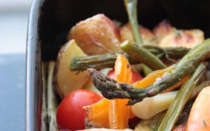Cuire 15 min au four, puis ajoutez les carottes et poireaux et remettre au four 5 min. Ensuite ajoutez les asperges, mélangez le tout, rajoutez éventuellement 1 c à soupe d'huile d'olive. Mélangez et remettre au four 10 min. Au total 30 min de cuisson.