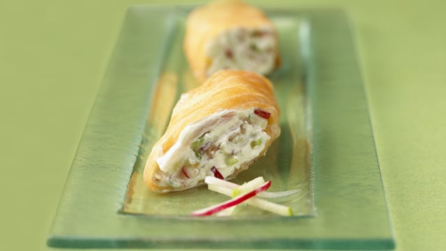 Recouvrez chaque tranche de Fromage Fouetté Madame Loïk Radis Fins Herbes. Répartissez dessus les lamelles de radis et la julienne de pomme. Roulez délicatement la tranche de saumon garnie en serrant bien.