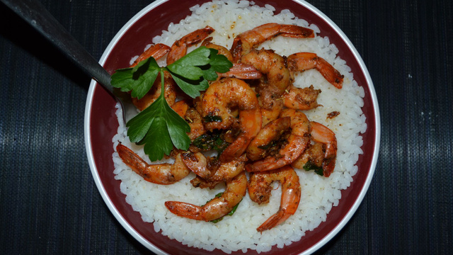 Vous pouvez laisser les queues pour la présentation. Quand les crevettes commencent à dorer, ajoutez le vin blanc et le jus de citron. Enfin, parsemez le tout de persil et de sel. Accompagnez ces délicieuses crevettes (oui, c'est vraiment un délice) d'un peu de riz ou de légumes (ou les deux, soyons fous!).