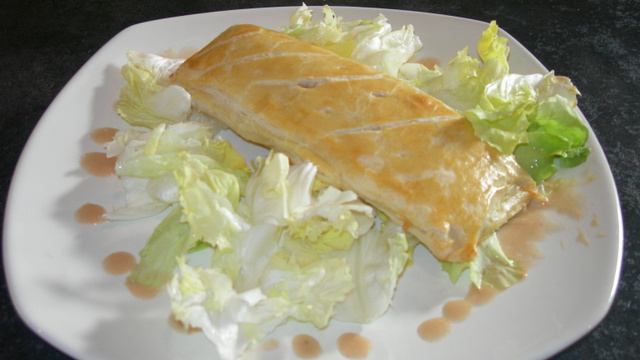 je dispose une demi-tranche de jambon, 1 cuillerée a soupe de gruyère râpé et un cuillerée rase de ciboulette. Je replie la pâte et soude les bord en appuyant légèrement avec mes doigts.