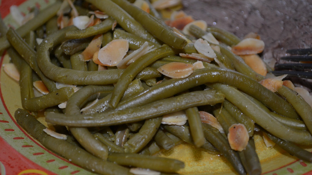 Faites revenir les haricots à la poêle avec un peu de beurre. Ajoutez les amandes effilées. Quand elles sont dorées, versez le jus d'un demi citron. Salez, poivrez.