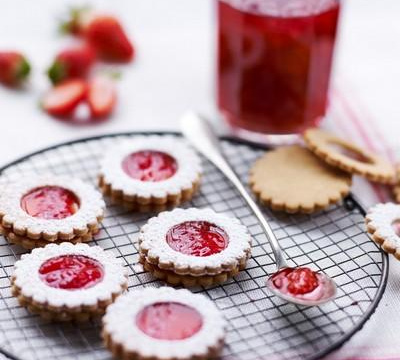 Recouvrez de sucre glace les ronds de pâte percés. Déposez au centre des ronds plein un peu de confiture de fraise. Etalez puis recouvrir avec le sablé troué. Dégustez.