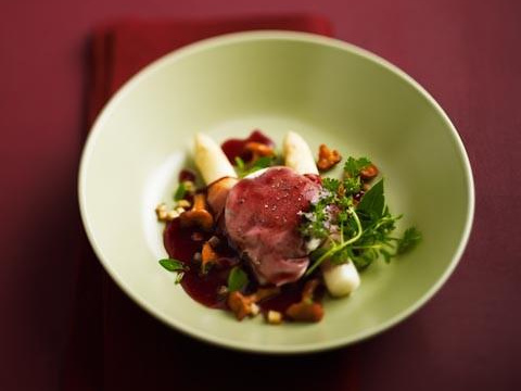 Sur une grande assiette dressez 2 asperges parallèles, garnir l'espace de champignons.