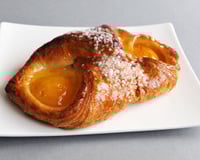 Couper des carrés dans la pâte feuilletée. Garnir d'une belle cuillère de crème pâtissière avec deux tranches d'abricot.